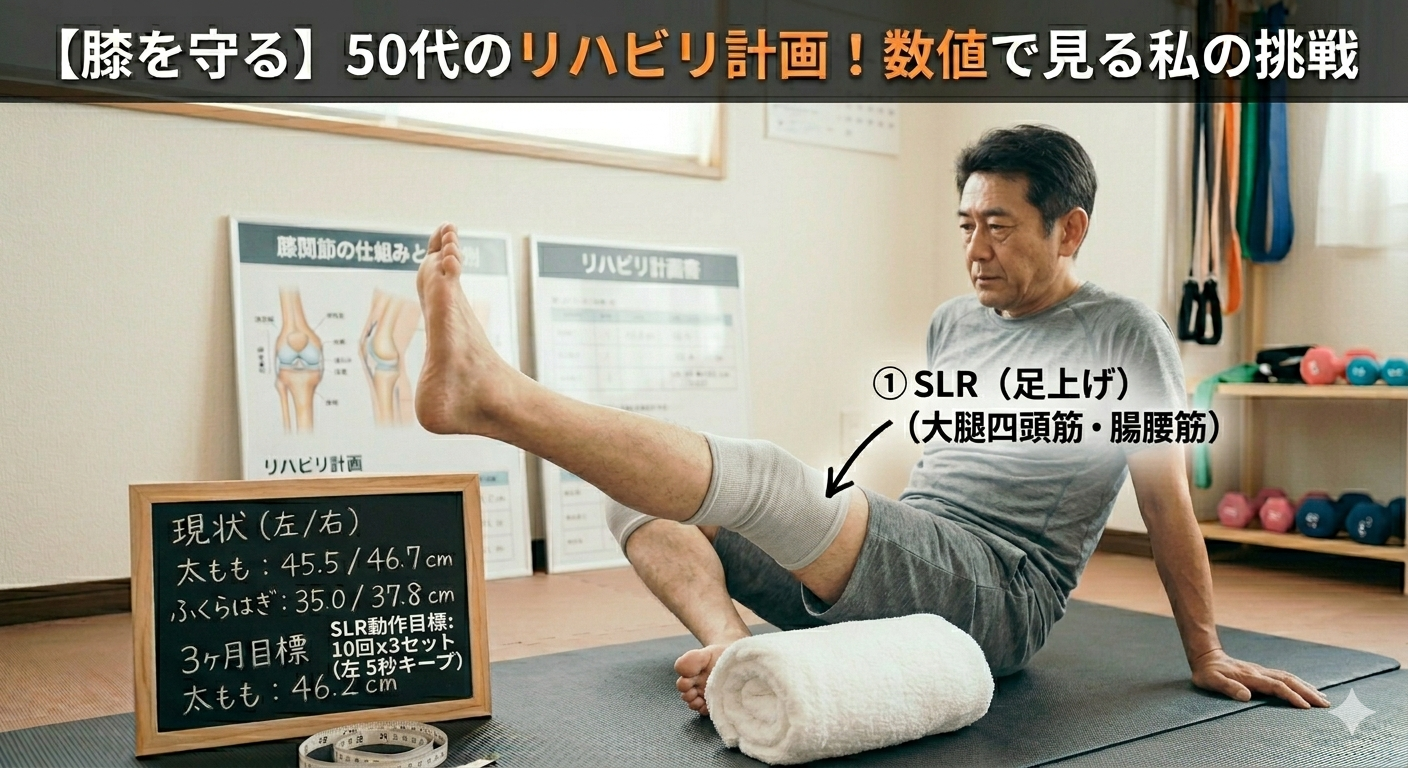 - 長期目標(半年後):左右の太さをほぼ同じにし、1日1万歩歩いても腫れない膝へ。